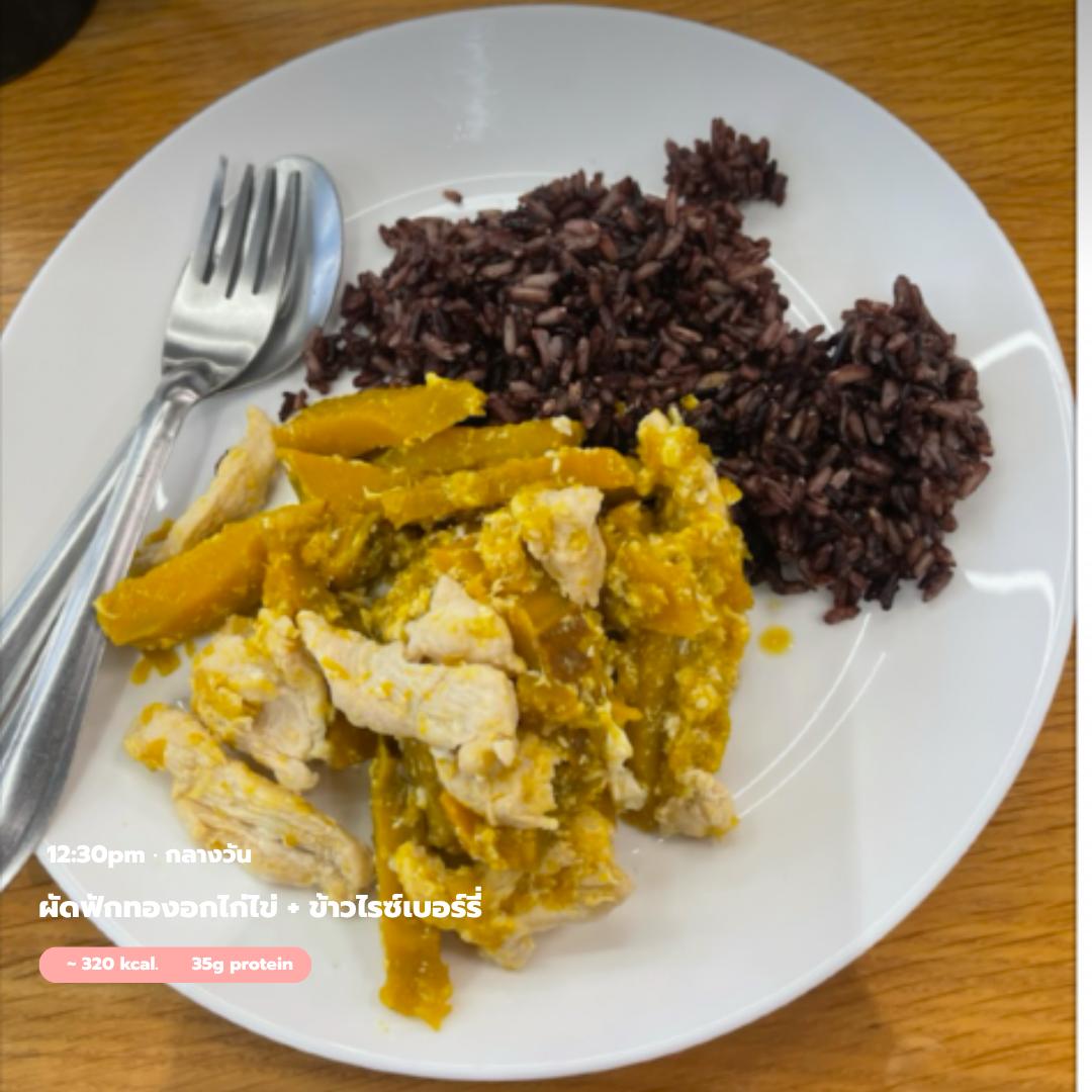 กลางวัน: ผัดอกไก่ฟักทองไข่ดาว + ข้าวกล้อง
