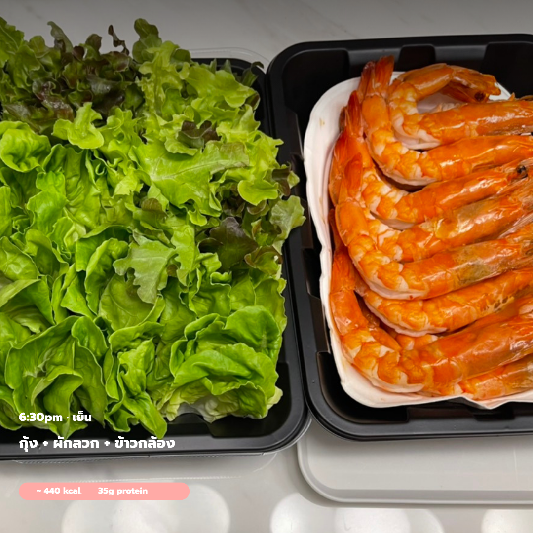 เย็น: กุ้งกระเทียม + ผัก