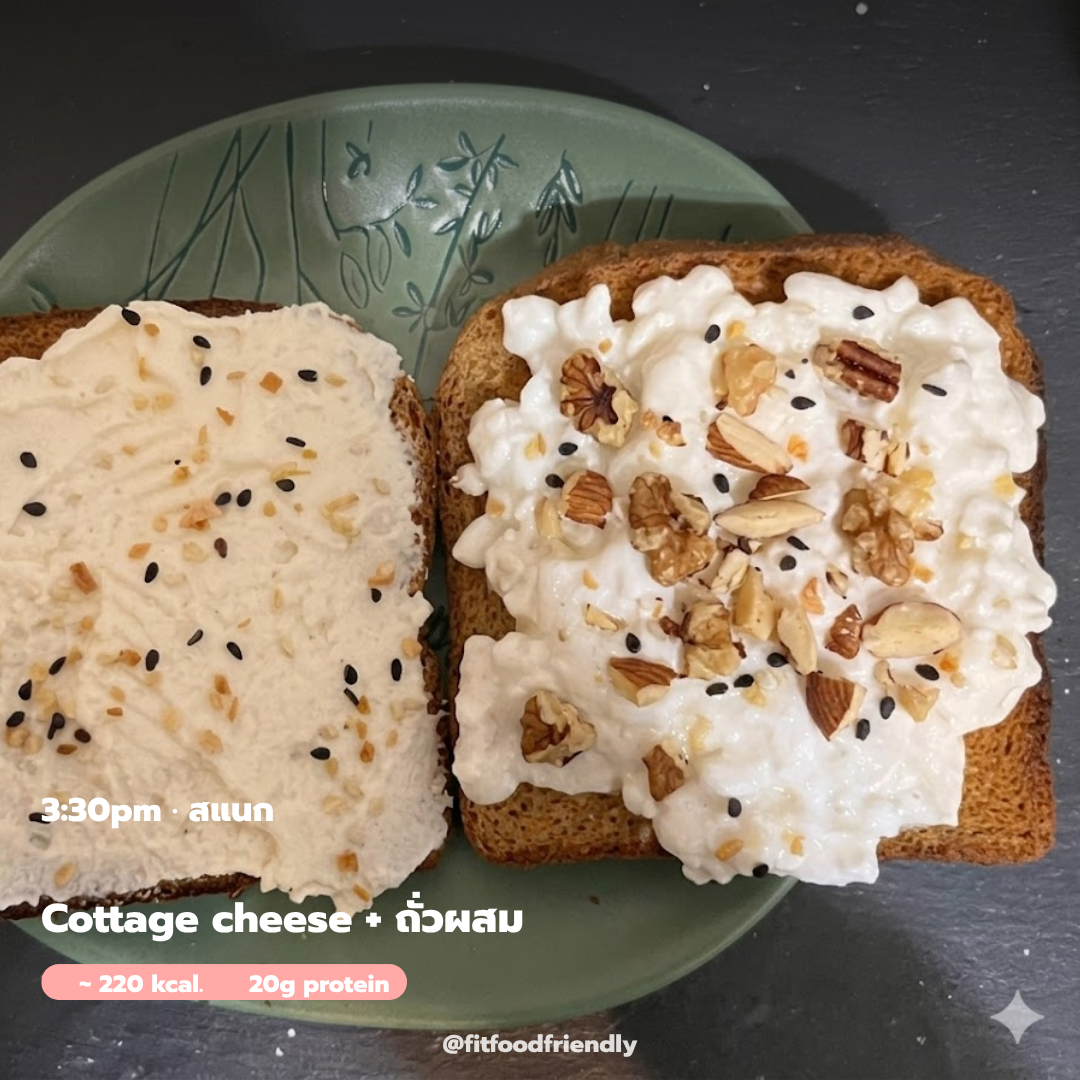 snack 3:30pm นี่สำคัญมากเลยนะ เพราะมันทำให้เราไม่เดินไปเปิดตู้เย็นบ่อยๆ ระหว่างบ่าย 2-6 โมงคือ “danger zone” ที่เราหยิบขนมมากที่สุด การมี snack ที่วางแผนไว้แล้วช่วยตัดพฤติกรรมนั้น Cottage cheese + ถั่วผสม = snack ที่ดีที่สุดสำหรับ WFH โปรตีน 20g อิ่มนาน ไม่ต้องทำอาหาร และสามารถกินที่โต๊ะทำงานได้เลย